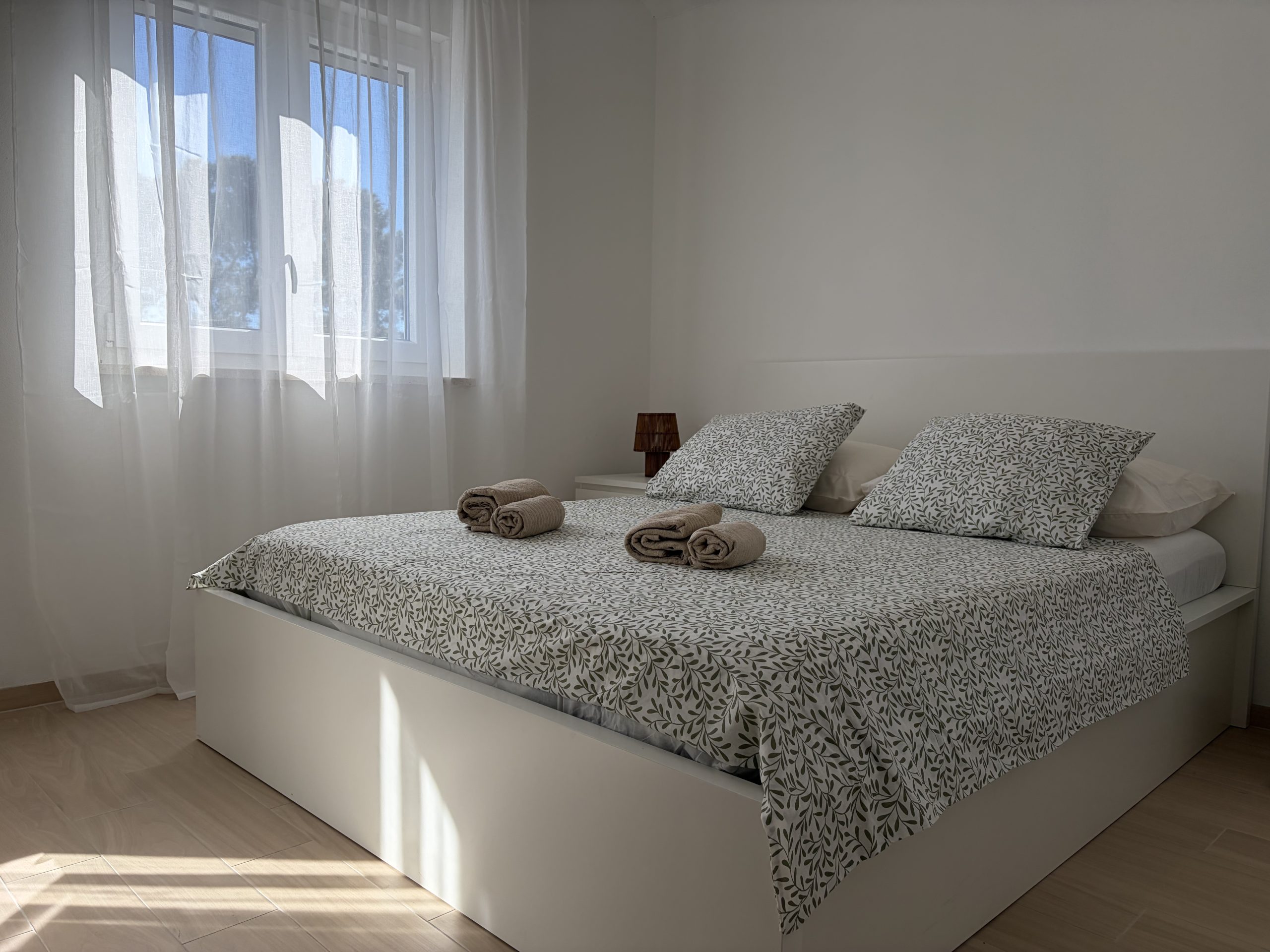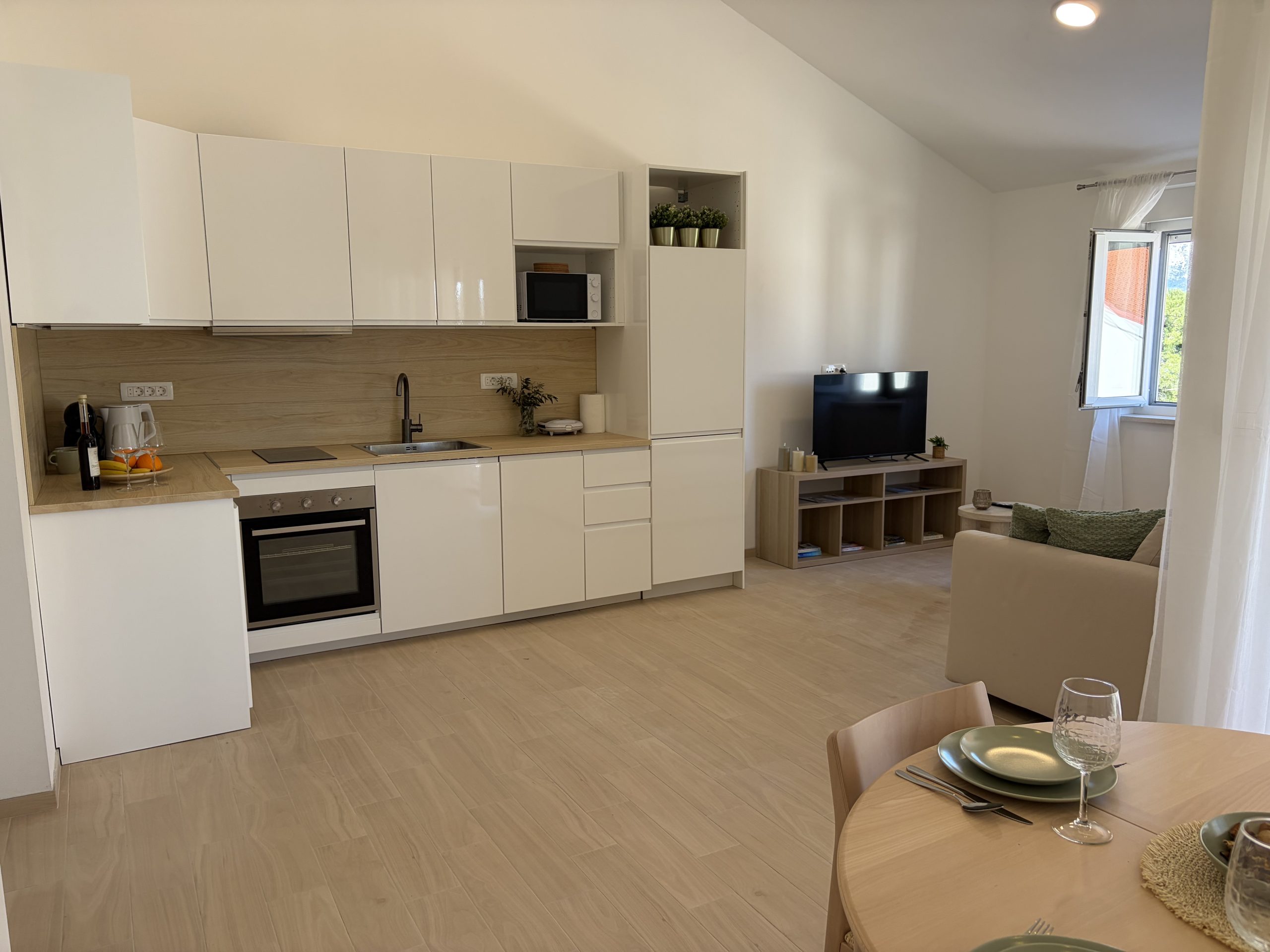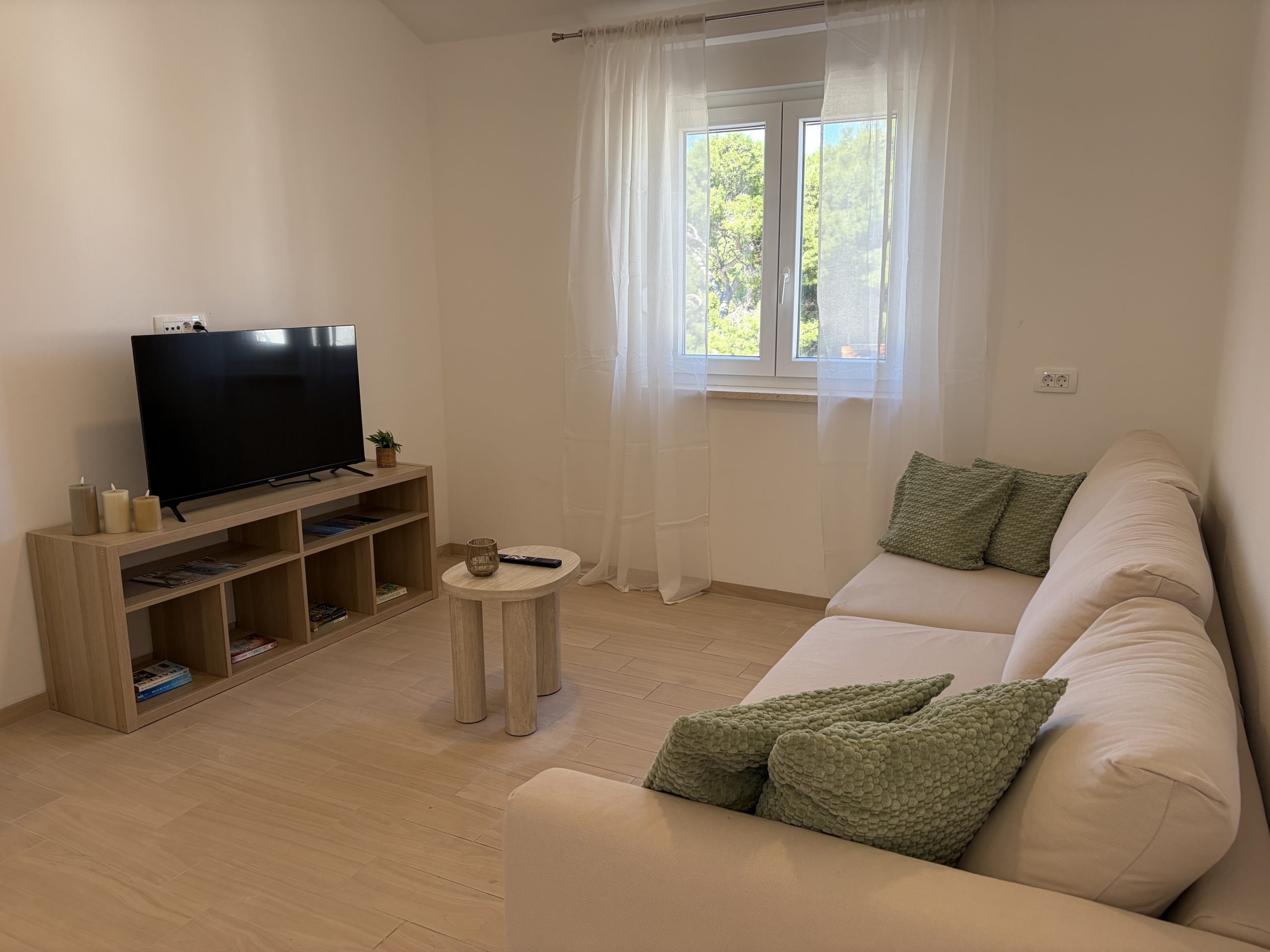 Apartments Verde consist of two completely identical apartments located in a newly built house, surrounded by olive trees and lush greenery, offering a peaceful and authentic Mediterranean setting.Each apartment features a fully equipped kitchen, dining area, and comfortable living room, as well as a bedroom, bathroom, and a private balcony with beautiful views of the greenery and the sea. The interiors are thoughtfully designed to provide comfort and a relaxing atmosphere, ideal for couples or small families.Private parking is available within the property and is free of charge for guests. The town center is just a 5-minute walk away, allowing you to enjoy both tranquility and easy access to restaurants, shops, and local attractions.